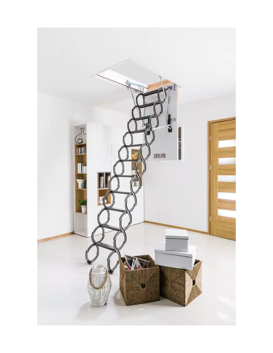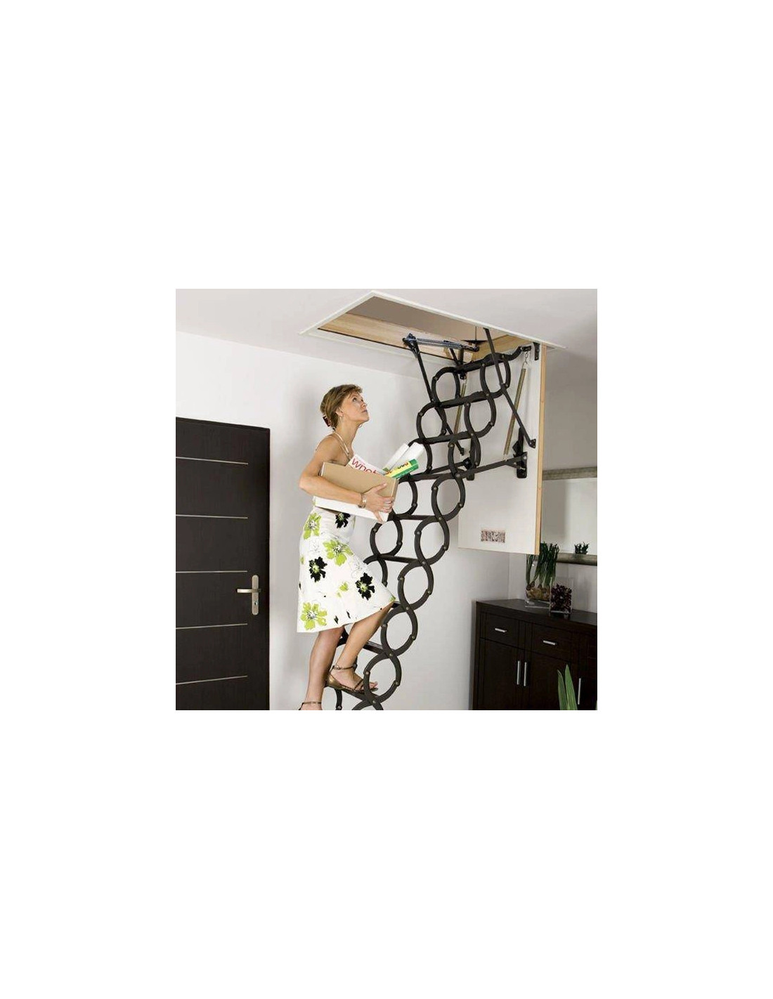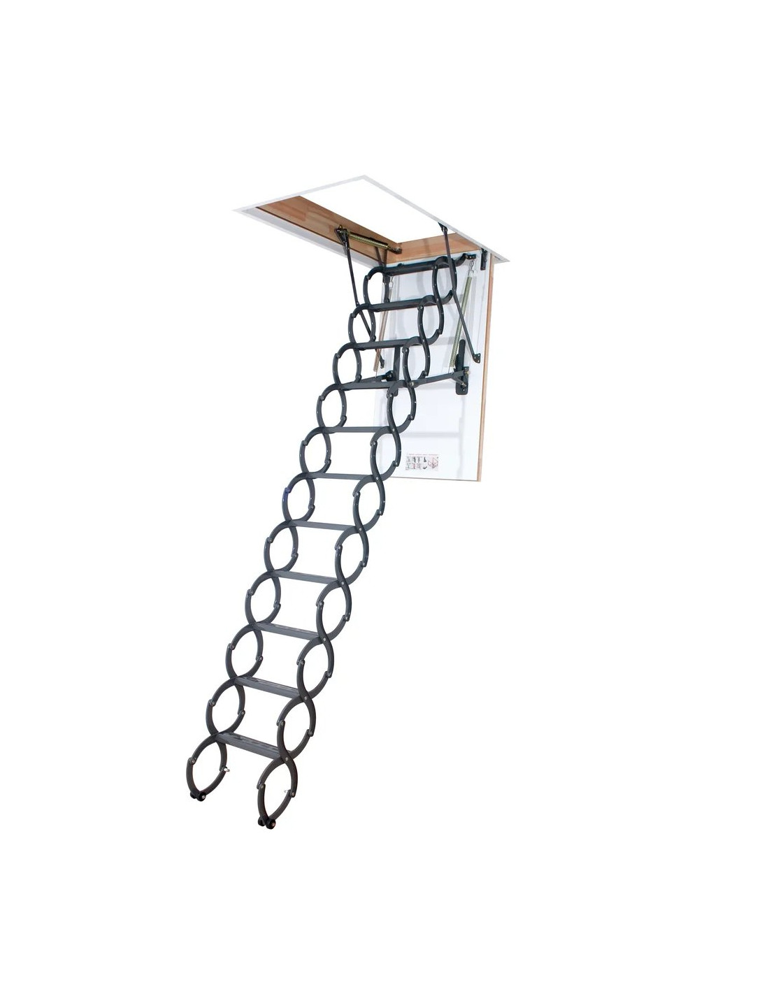 - Komfortiškas valdymas: Specialus mechanizmas palengvina laiptų išskleidimą ir suskleidimą. Naudojant komplekte esančią lazdelę, laiptus lengvai pasieksite net esant aukštoms luboms.