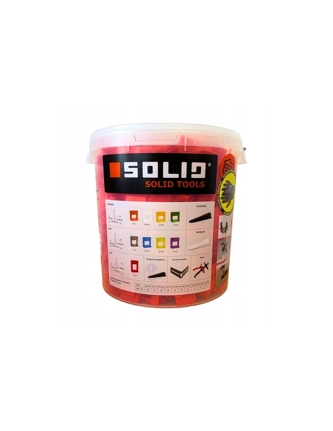 „SOLID“ lyginimo sistema sukurta tam, kad plytelių klojimo procesas būtų greitesnis, paprastesnis ir be klaidų. Naudojant šį 800 vienetų klipsų rinkinį, užtikrinamas vientisas ir lygus paviršius dideliuose plotuose, o patogus kibiras padeda palaikyti tvarką darbo vietoje.